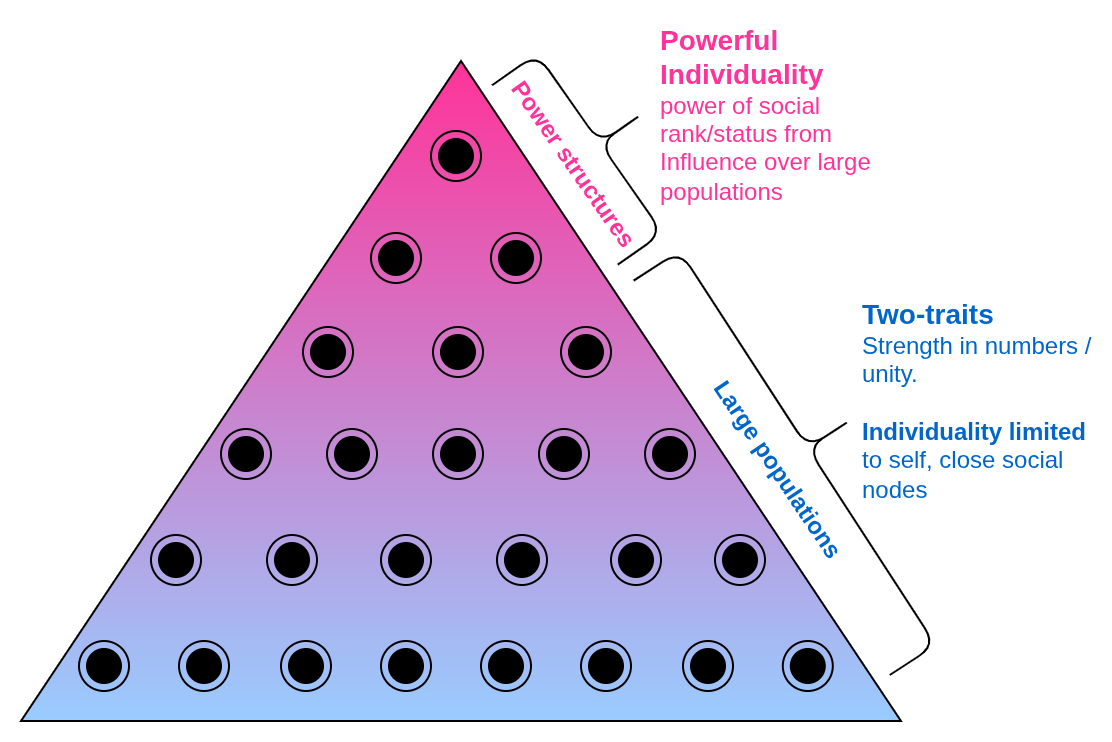 - Balanced incorporation of the two-traits and individuality can promote social responsibility and prevent reward-maximising behaviour among individuals. Tradeoff between individuality and two-traits is observable is social hierarchy. Individual identity/role is powerful and influential from high rank nodes / personalities POV whereas strength of large populations comes from being in cohesion through two-traits.